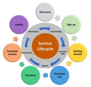 The central gray circle in the lifecycle diagram shows a continuum of all of the above-mentioned touchpoints. These tools are going to ensure customer success with the service.